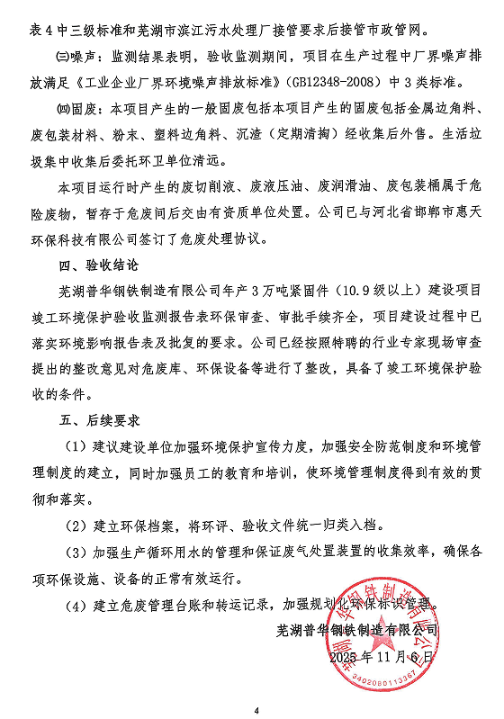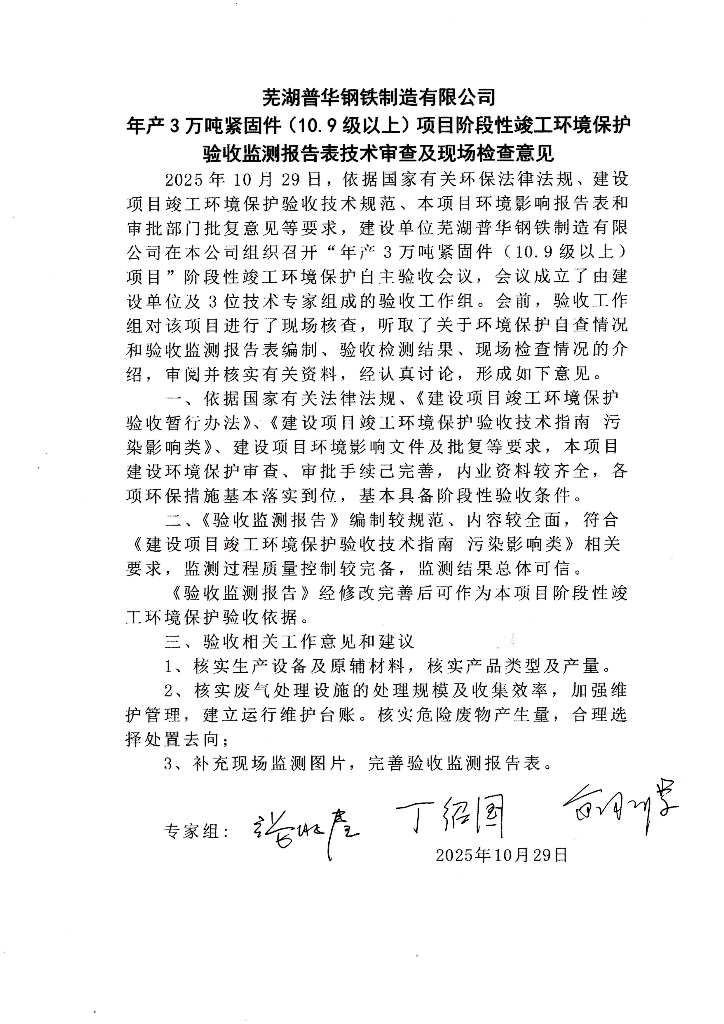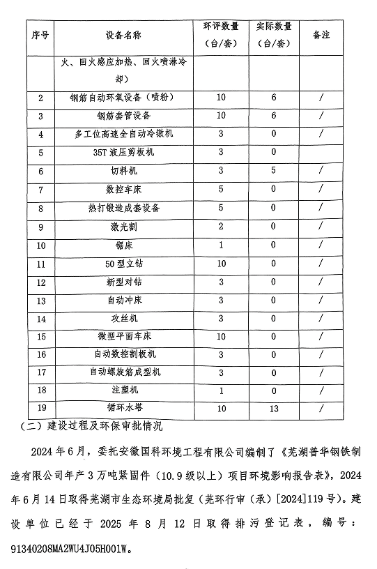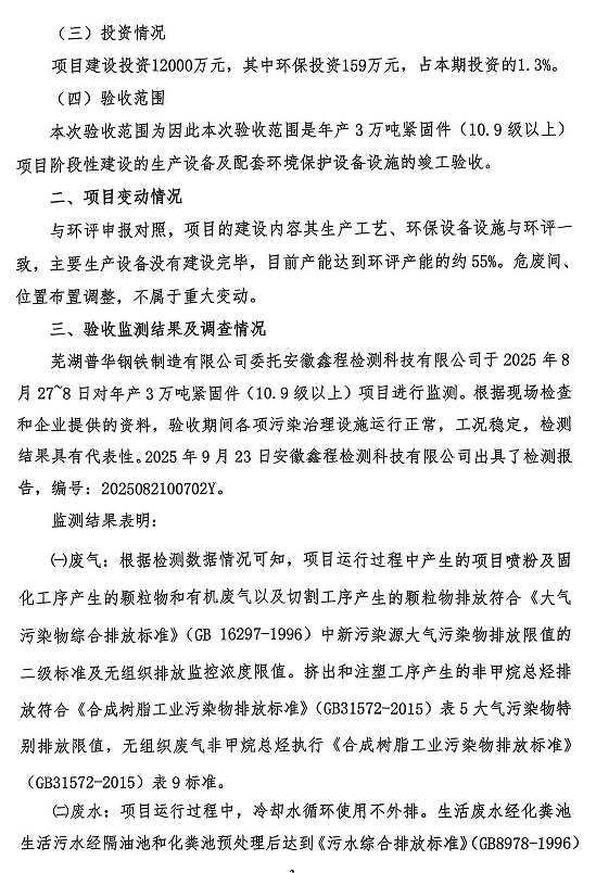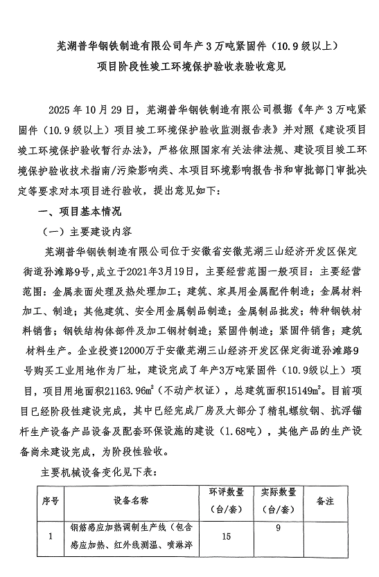 芜湖普华钢铁制造有限公司年产3万吨紧固件(10.9级以上)项目阶段性竣工环境保护验收公示